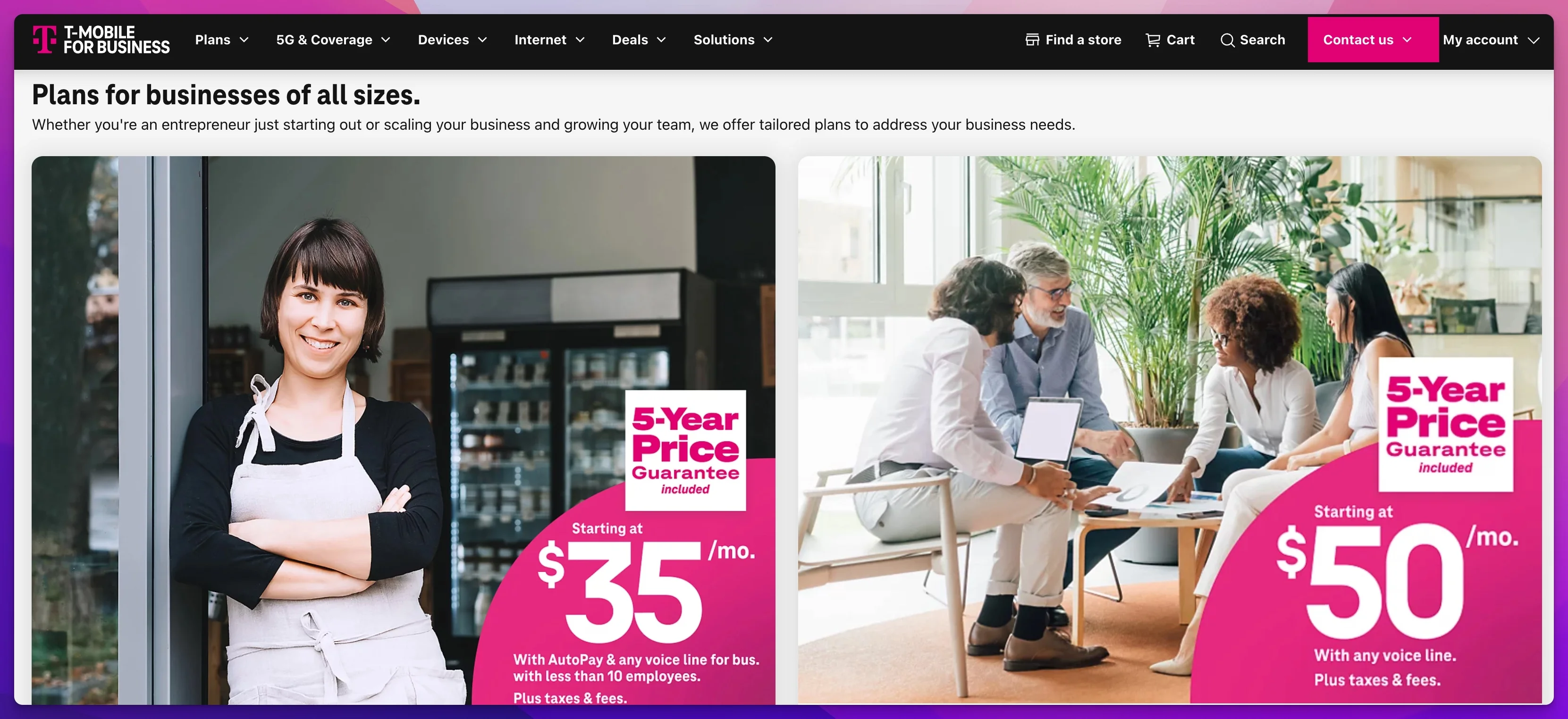 T-Mobile's small business tiers start lower: Business Grow at $35/mo and Business Advanced at $50/mo for larger commercial spaces — both with no annual contract. The enterprise Business Internet tier starts at $70/mo for multi-location or higher-capacity deployments. No installation scheduling, no construction delay, no waiting for a technician to run cable. The gateway ships to you, you plug it in, and you're online.