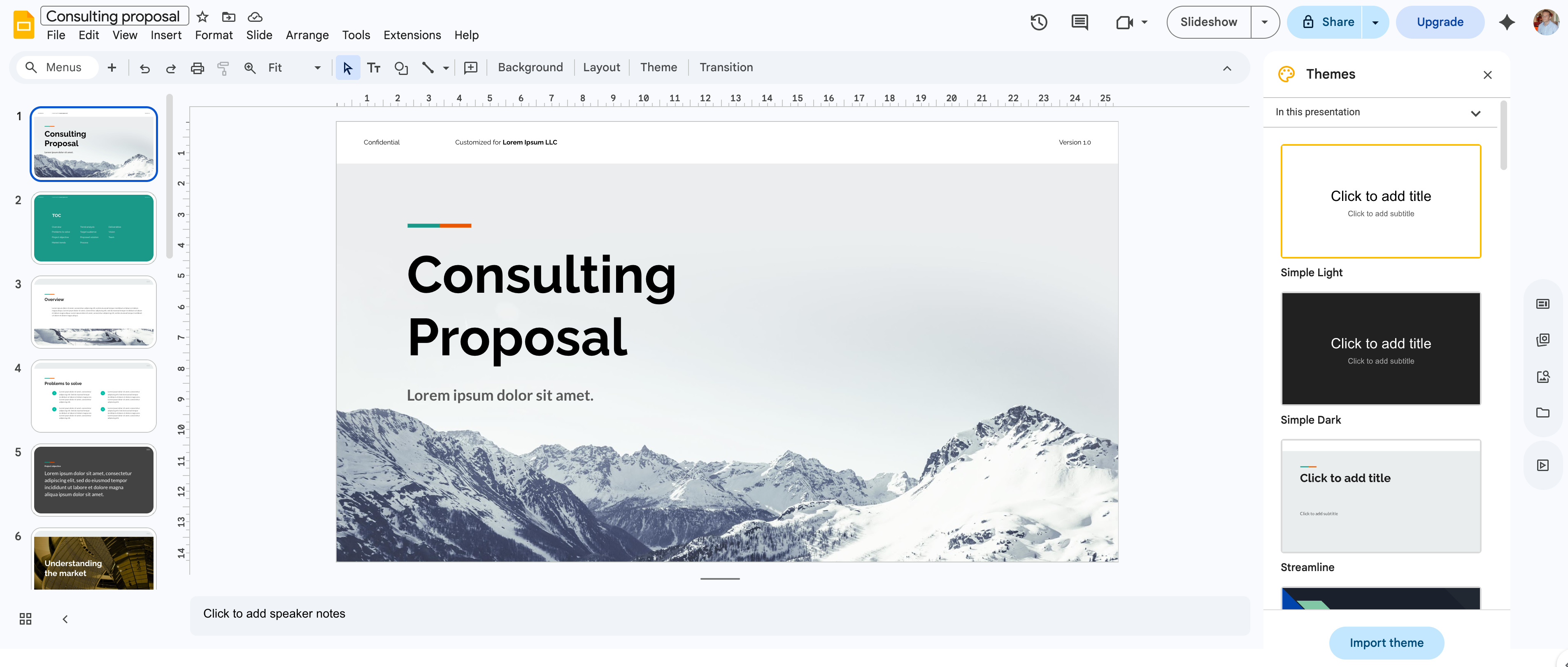 Google's built-in template gallery includes templates for business proposals, project status reports, pitch decks, portfolios, and educational presentations. They are clean and functional as a starting point.