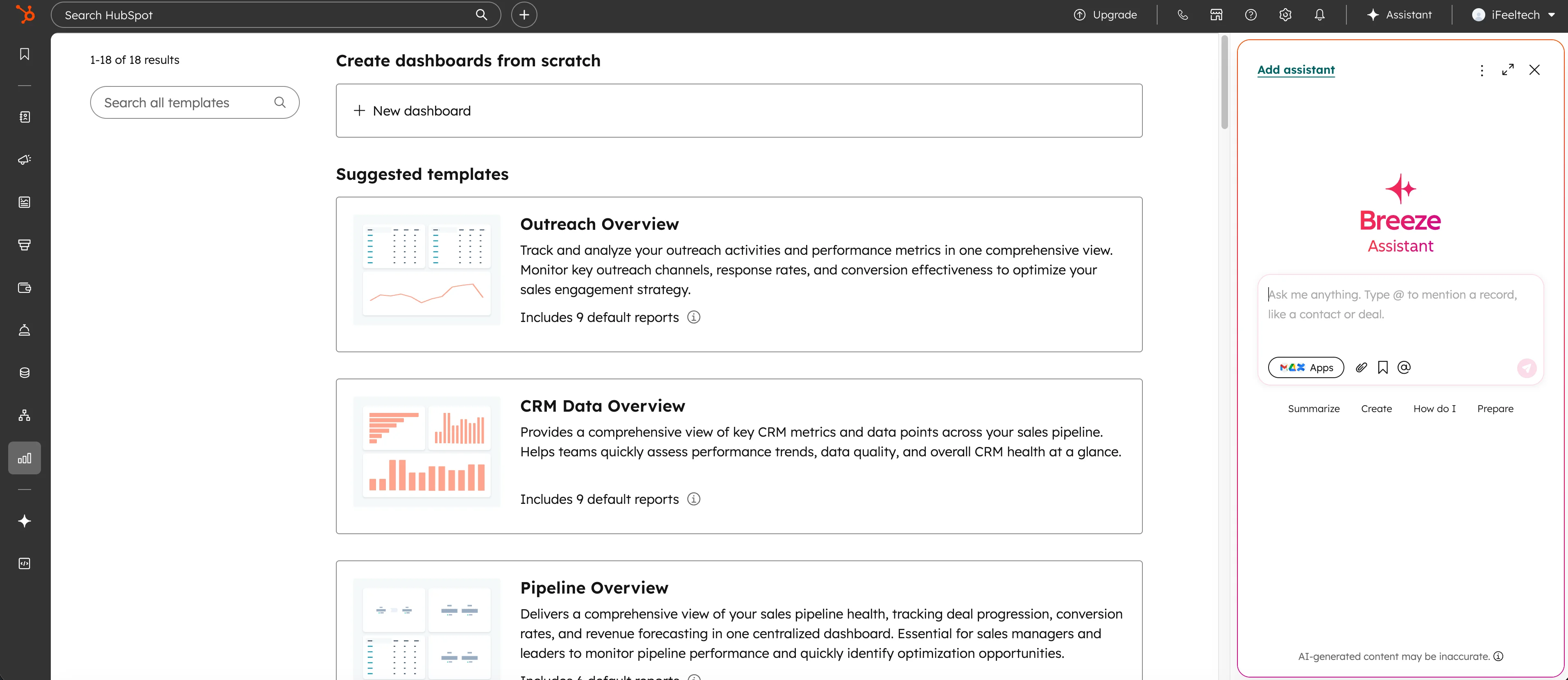 - Breeze Assistant (Copilot) — a conversational AI in HubSpot that can draft emails, summarize contact records, create tasks, and answer questions about your deals using your actual CRM data