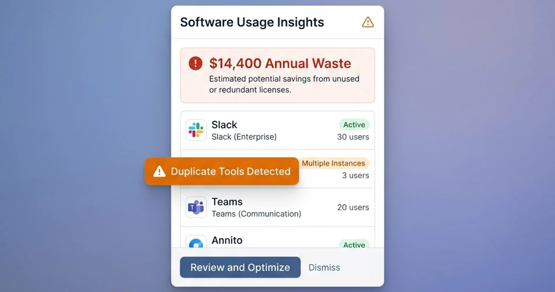 This is different from zombie subscriptions. These tools are actively used — just by different groups doing the same thing. The most common overlaps we see: Microsoft Teams and Slack running simultaneously. Zoom and Teams Phone both active. Google Drive and Dropbox in parallel across departments.