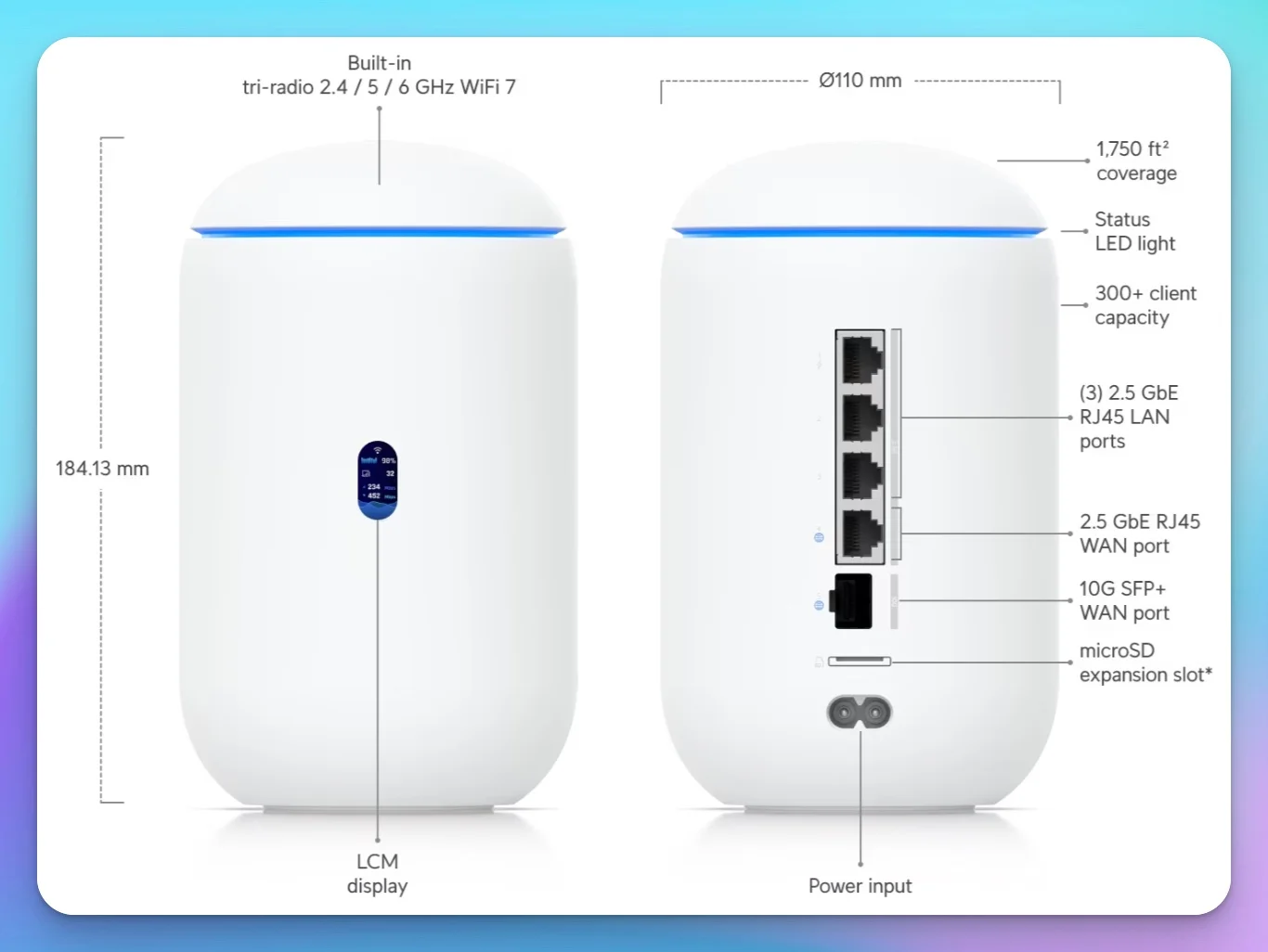 - Backup WAN: Cable modem, Starlink, or UniFi 5G Max via 2.5G RJ45 WAN port