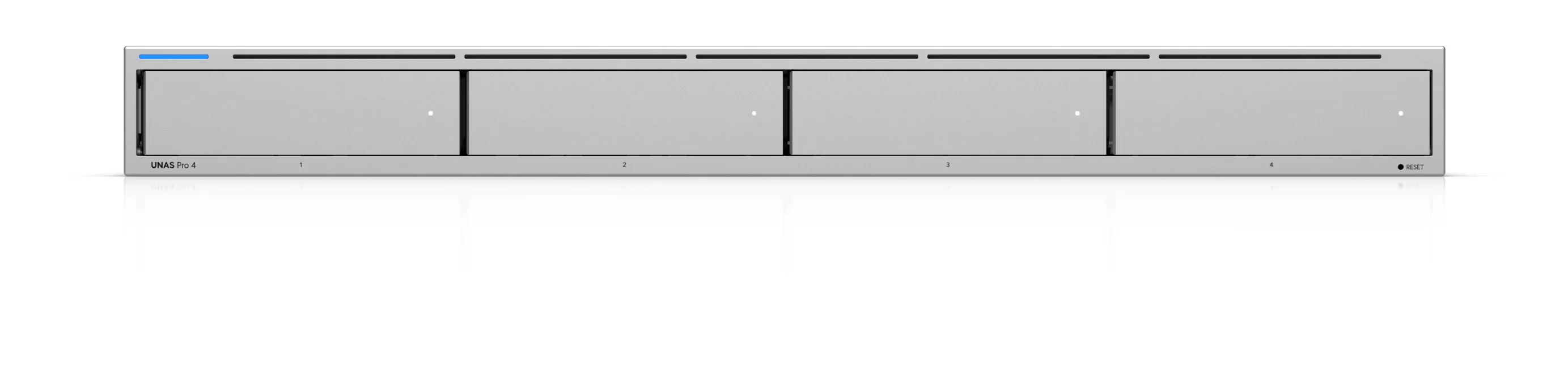 Noise profile: The UNAS Pro 4 uses small, high-RPM fans typical of a 1U chassis. Under load, it is louder than a desktop NAS or 2U unit with larger fan blades. It is appropriate for a dedicated server room, network closet, or rack enclosure — not for placement near workstations or in open office environments.
