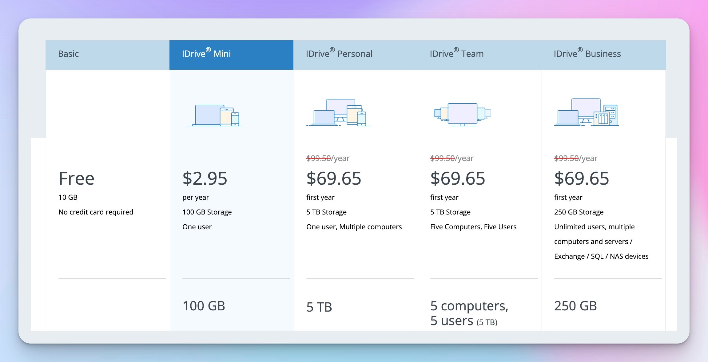 iDrive Business pricing is structured around storage capacity rather than user counts or device counts, which can provide significant value for organizations with many devices to protect.